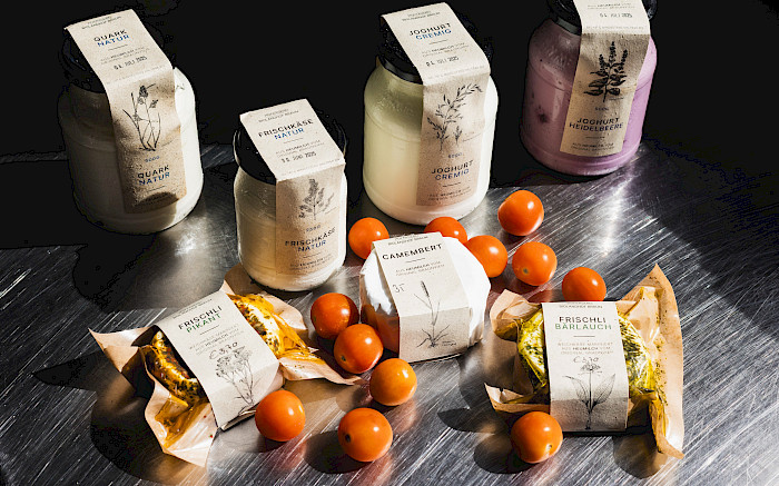 Die Erzeugnisse des Hofes sind direkt vor Ort im Hofladen erhältlich – darunter auch die Spezialitäten aus der eigenen Käserei. Aus der Milch von rund 20 Kühen – Schwarzbunte mit Zucht auf Lebensleistung und muttergebundener Kälberhaltung – entsteht ein vielfältiges Sortiment an Schnitt- und Edelschimmelkäsen aus Rohmilch sowie frische Milchprodukte wie Frischkäse und Joghurt. Die Kräuter für die verschiedenen Frischkäsesorten stammen selbstverständlich aus dem eigenen Garten, und das Angebot variiert je nach Saison.